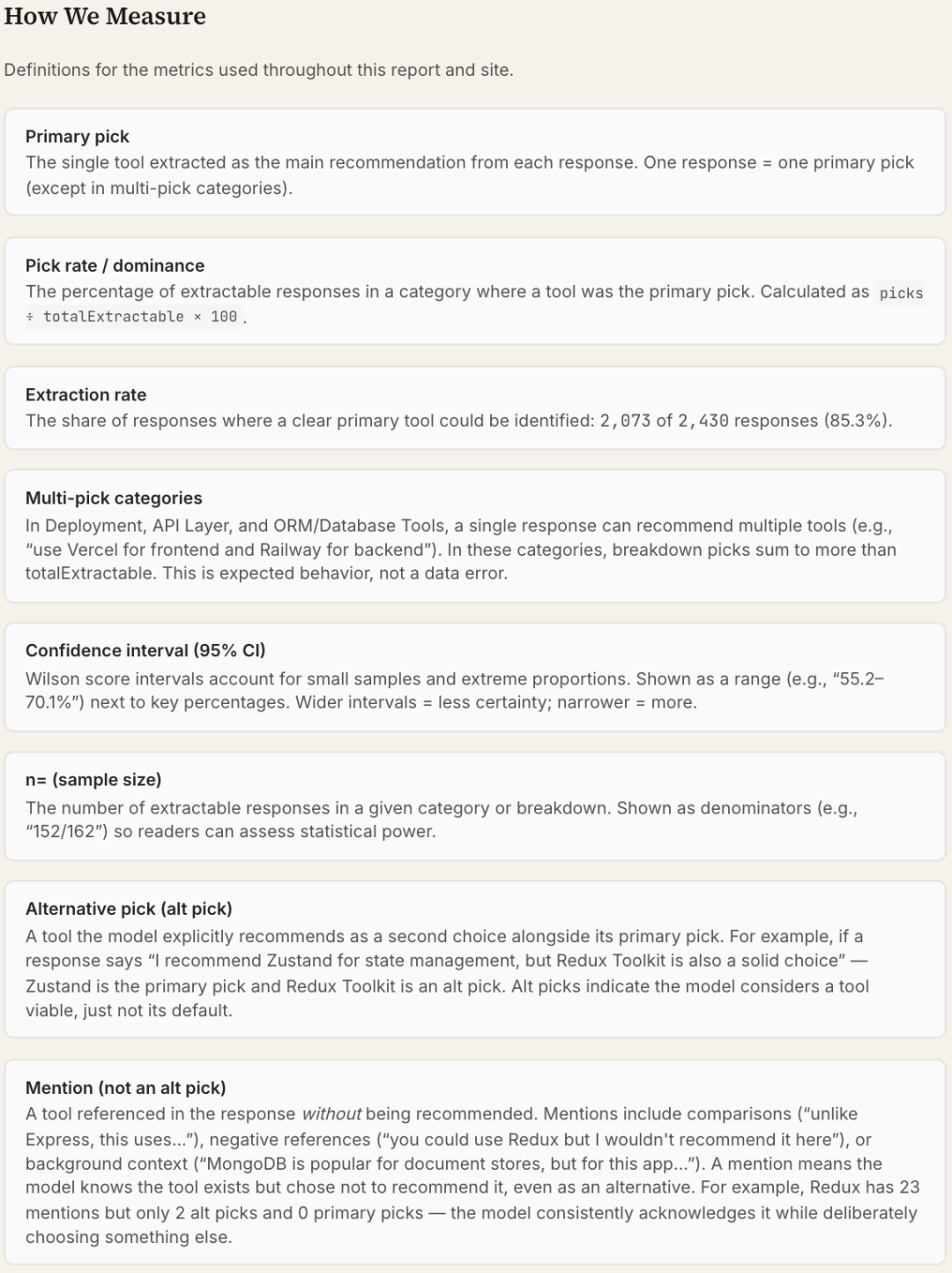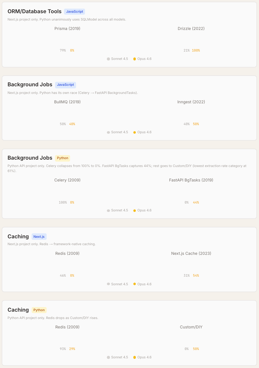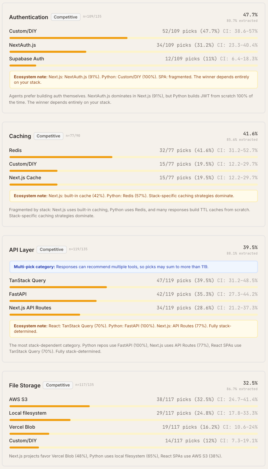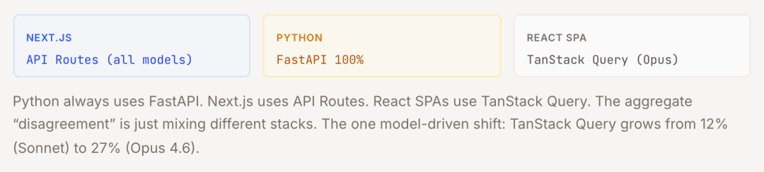 团队细分4个测试仓库的每个工具类别,对比三款模型的选择差异发现:同一模型在Next.js项目中会推荐Drizzle作为ORM工具,而在Python项目中则会选择SQLModel(具体细节可查看完整研究报告)。