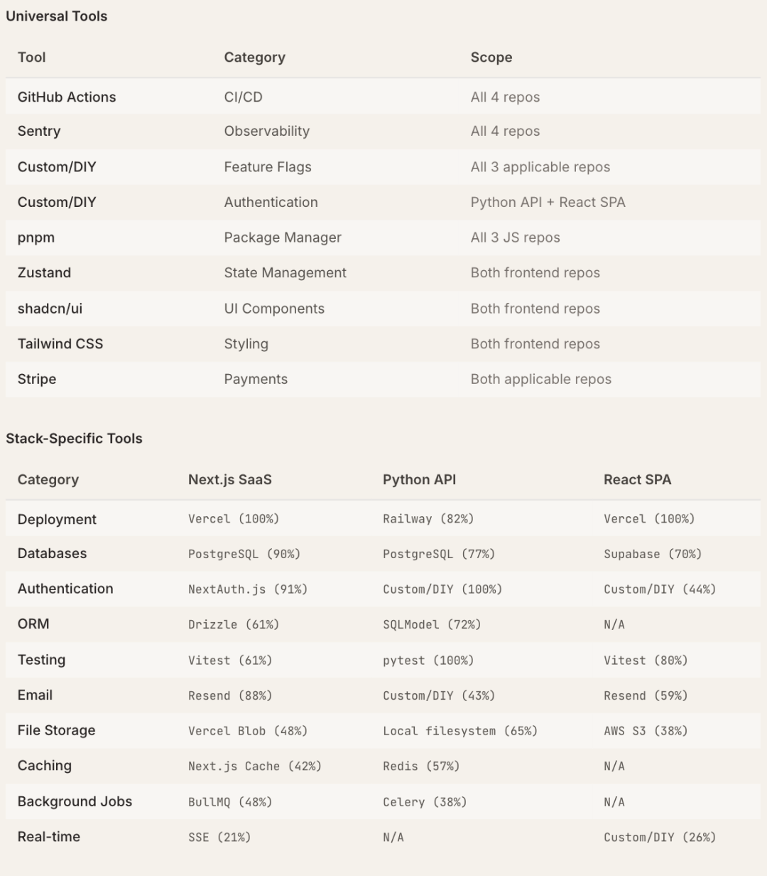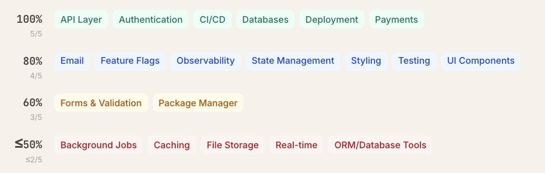 GitHub Actions占据CI/CD类别94%的选择,shadcn/ui占据UI组件类别90%的选择,Stripe占据了支付类别91%的选择。