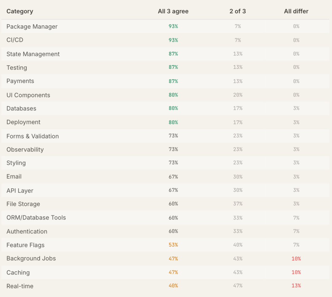 在同一生态(比如都是JS或都是Python)内比较时,三个模型在20个类别中的18个,都选择了相同的首选工具。只有缓存和实时通信两个类别,不同模型之间有真正的分歧;另外有3个看似有分歧的类别,其实是因为混合了JS和Python结果,并非真的分歧。