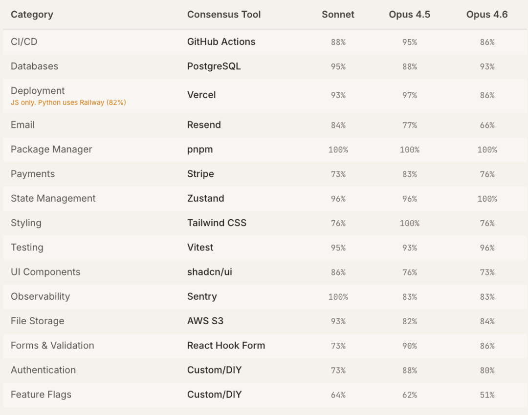 Opus 4.6更倾向推荐新工具与自定义方案,而4.5代模型更偏好成熟稳定的工具。