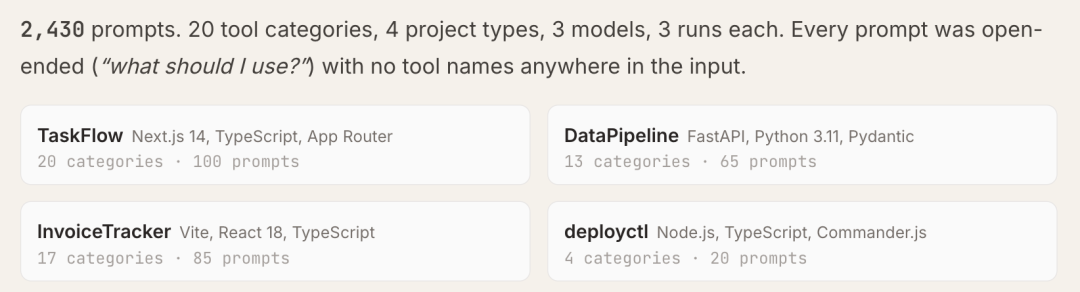 研究覆盖3款模型、4种项目类型及20个工具类别,累计分析了2430次工具选择行为。