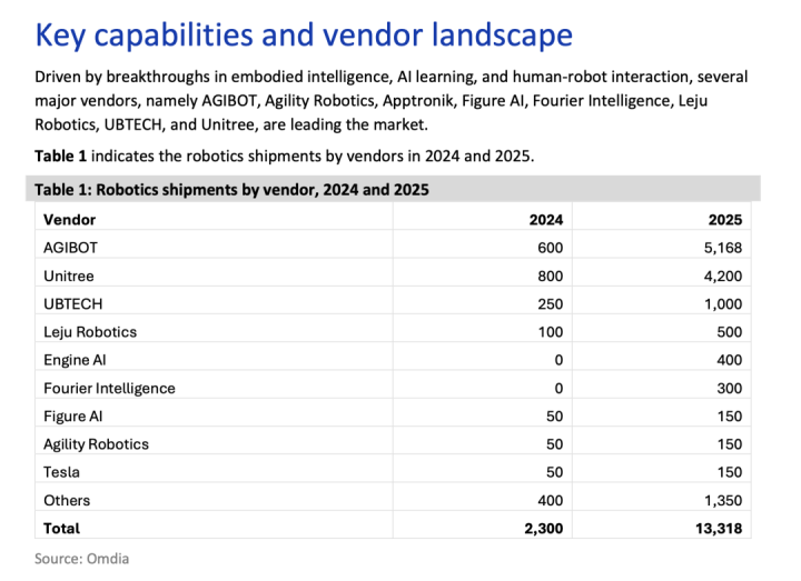 Omdia指出,智元、宇树科技、特斯拉等厂商作为全球人形机器人领域的“第一梯队”,正在积极推动产业加速发展。