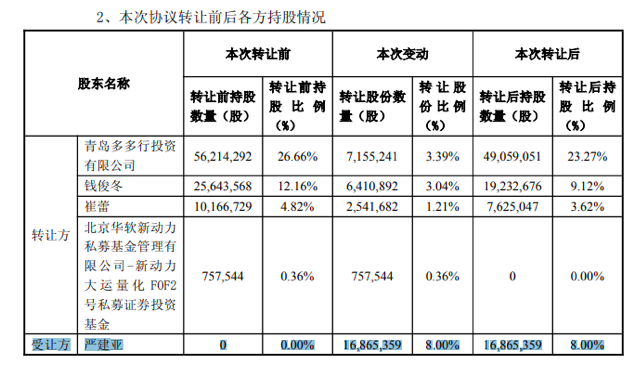 从交易结果来看,本次股权转让完成后,三人行控股股东青岛多多及其一致行动人合计持有公司股份9672.99万股,占公司总股本的45.88%;严建亚持股8%,成为公司第二大股东。同时,严建亚承诺自标的股份过户登记至其名下之日起12个月内不会减持标的股份。