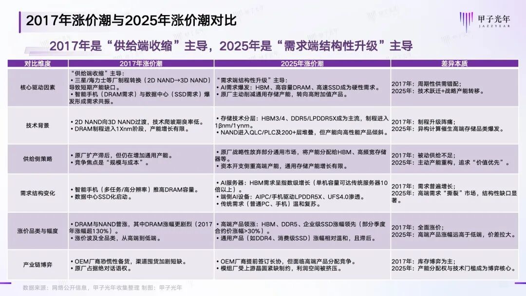 2017年与2025年存储涨价潮核心差异对比,「甲子光年」制图