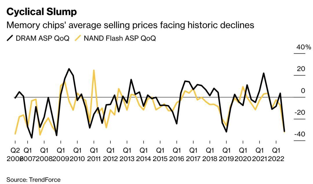 2008-2022年存储芯片平均销售价格变动周期图,数据来源:Trendforce,制图:Bloomberg