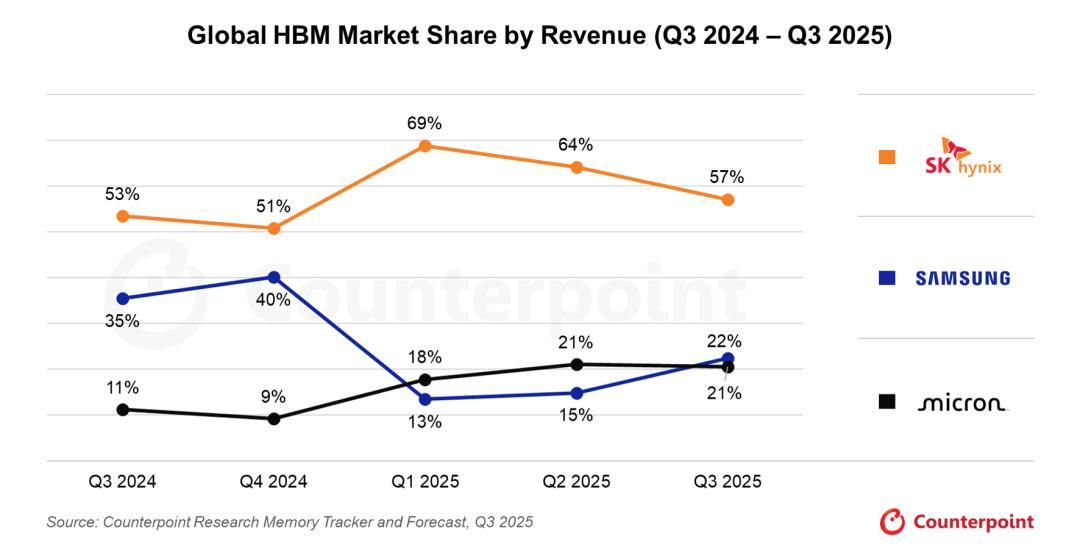 2024 Q3-2025 Q3三大原厂HBM营收市场占比,图片来源:Counterpoint